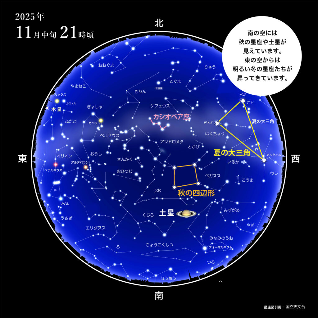 スマホの方位アプリなどで東西南北を確認しておくと、お目当ての星や星座が見つけやすくなります。