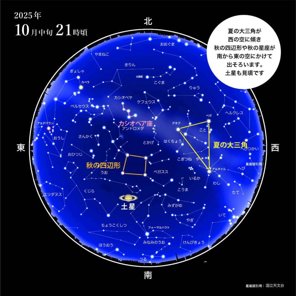 2025年の「中秋の名月」は10月6日ですが、この日は満月ではなく、翌日の7日がほぼ正確な満月にあたります。名月と満月の日付がずれるのは珍しいことではなく、今年はその近くに土星も輝きます。月明かりに負けて少し見つけにくいかもしれませんが、秋の空ならではの共演を楽しめるでしょう。